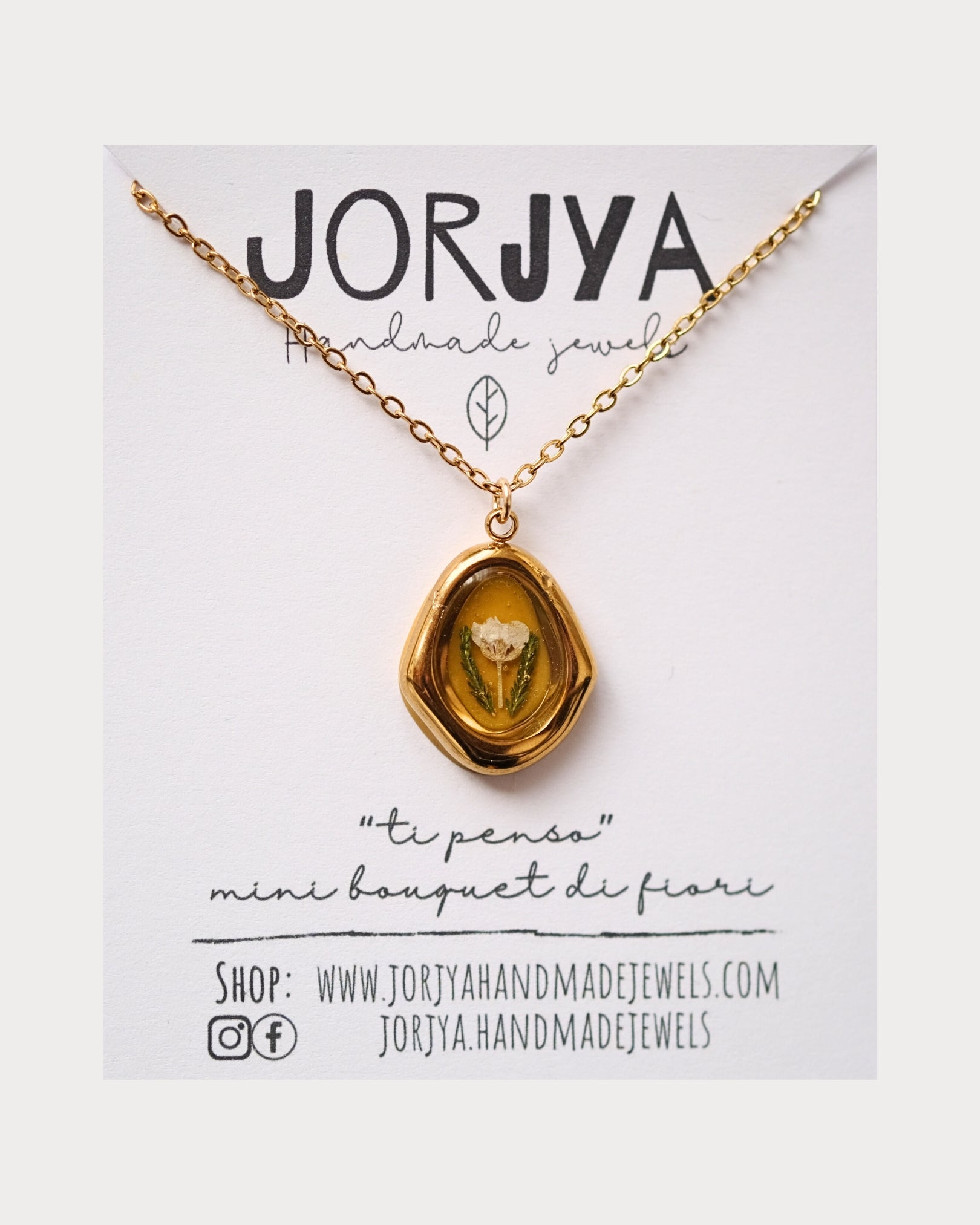 Questa collana è stata realizzata a mano e custodisce un piccolo bouquet di fiori di campo all'interno della resina con sfondo color senape.